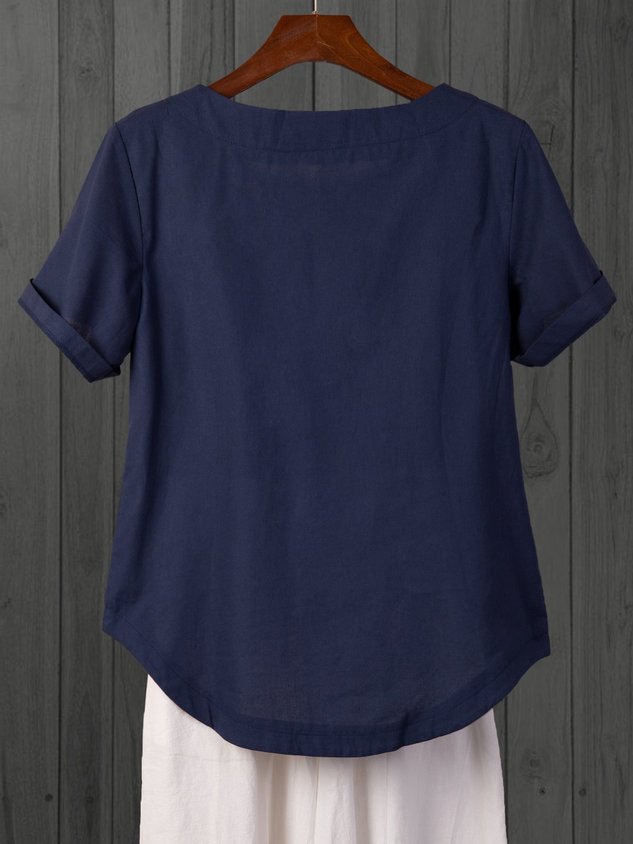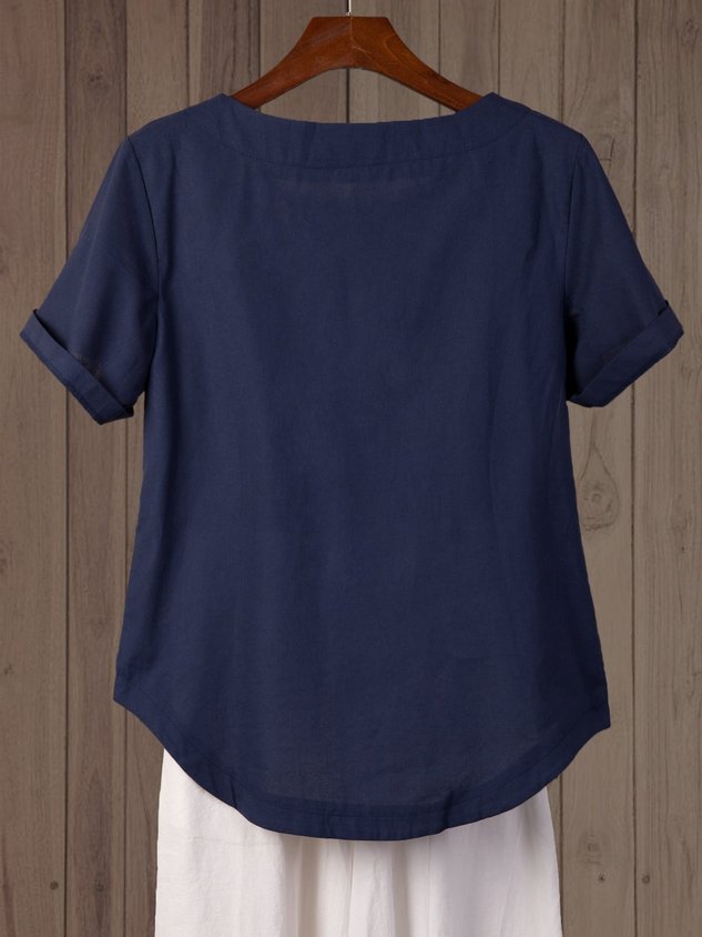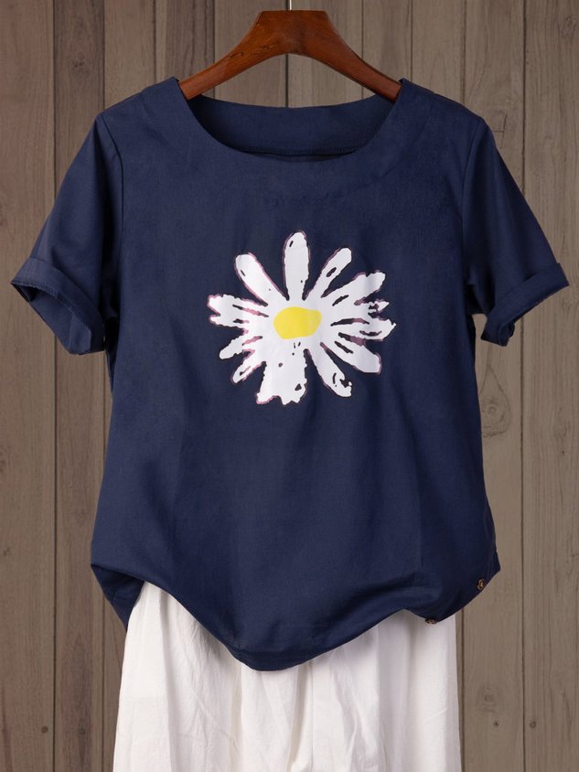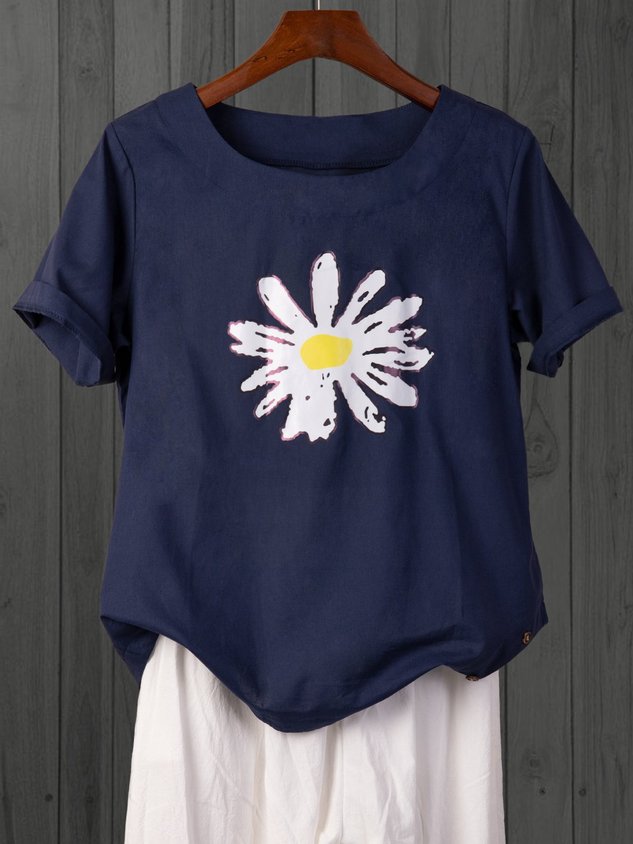 • Blue Floral-Print Casual Cotton T-shirt
