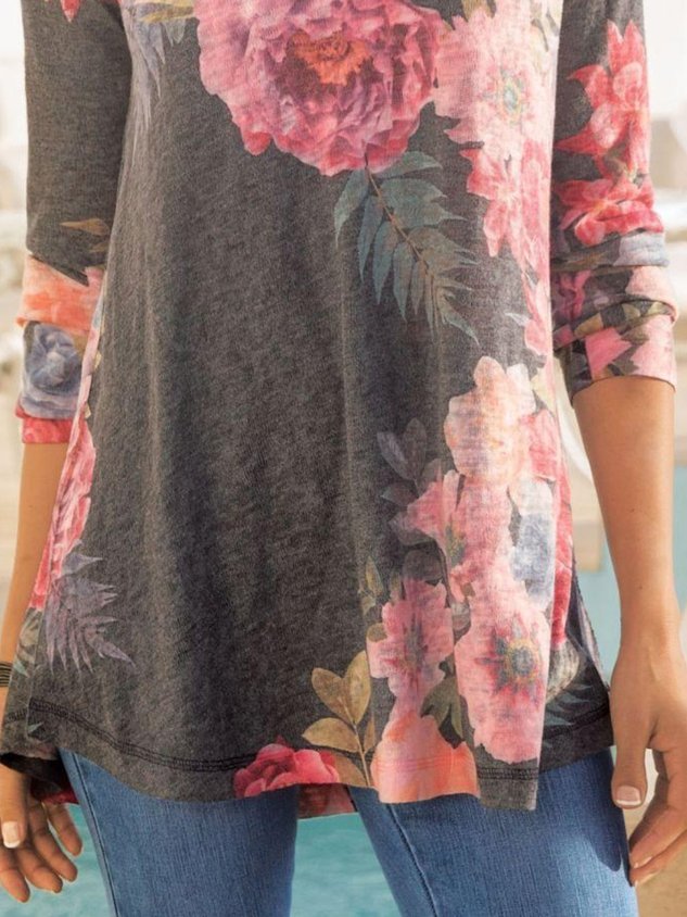 Cotton-Blend Casual V Neck Floral-Print Tunic T-Shirt