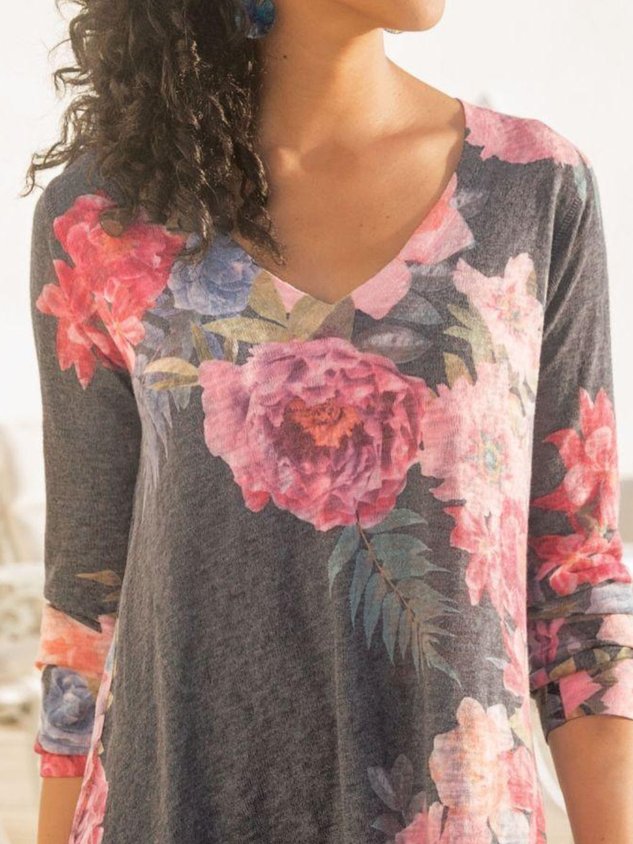 Cotton-Blend Casual V Neck Floral-Print Tunic T-Shirt