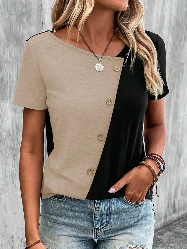 Casual V Neck Two Tone Button Front Color Block T-Shirt
