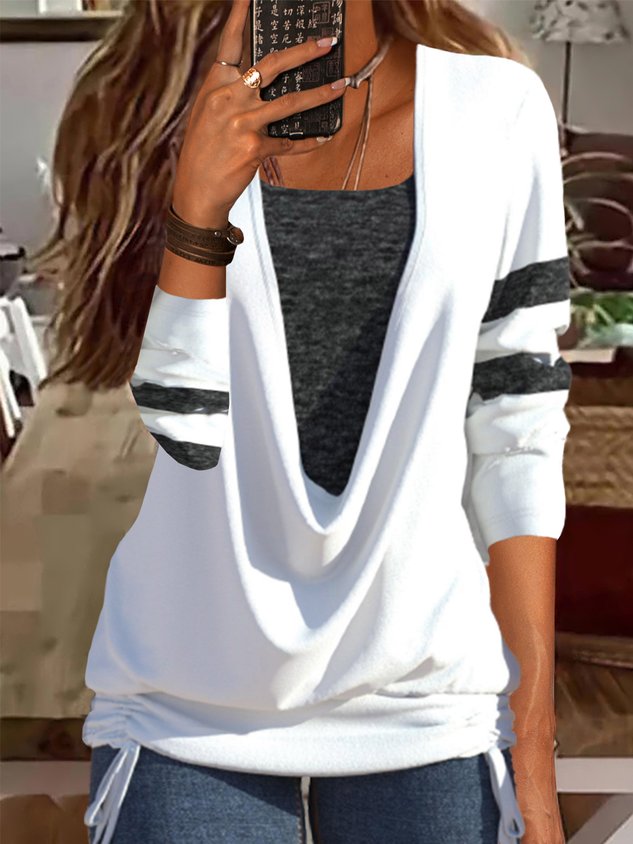 Casual Striped Shawl Collar Long Sleeve T-shirt